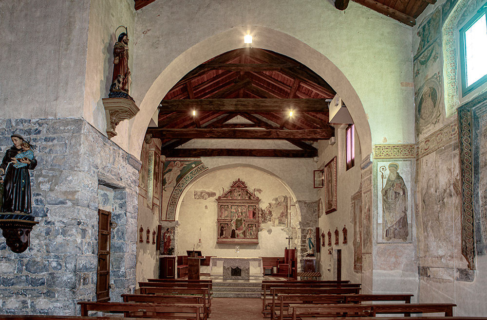Linterno si presenta essenziale nelle sue linee architettoniche. Unaula ad unica navata č divisa in due campate da un arco ogivale []. Il soffitto, con copertura lignea, segue le falde del tetto a capanna ed č sostenuta parzialmente da una serie di robuste capriate lignee []. Esse sono un valido esempio della tecnica campentieristica, impiegata nei secoli nella copertura di edifici. A sinistra si vedono la traccia dell'antico ingresso e la base del campanile in masselli di pietra []. L'arco trionfale, a tutto sesto [], immette nell'area presbiteriale a pianta rettangolare e rialzata di qualche gradino dal livello della navata []; li č presente un altare moderno in sostituzione di quello originale andato perduto []. Il soffitto č voltato a botte. L'interno č ricco di testimonianze artistiche risalenti ad epoche differenti.