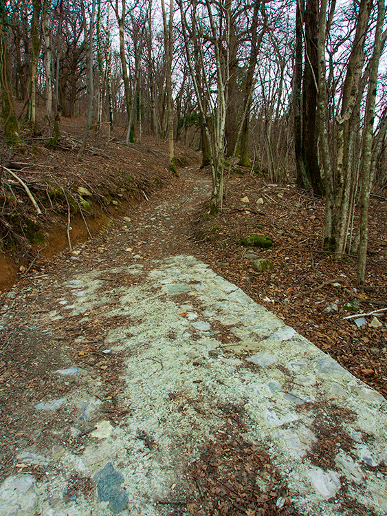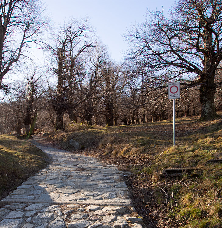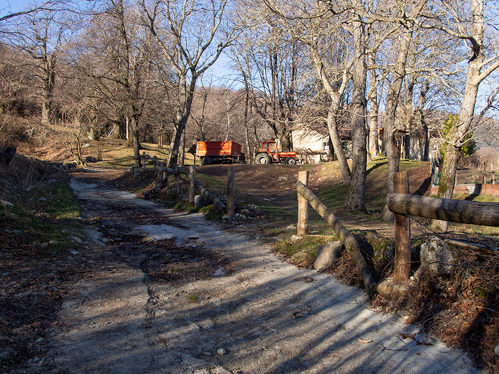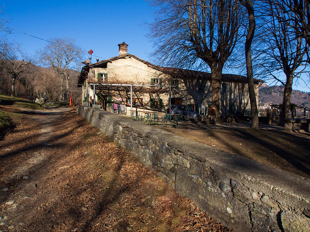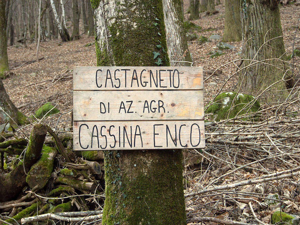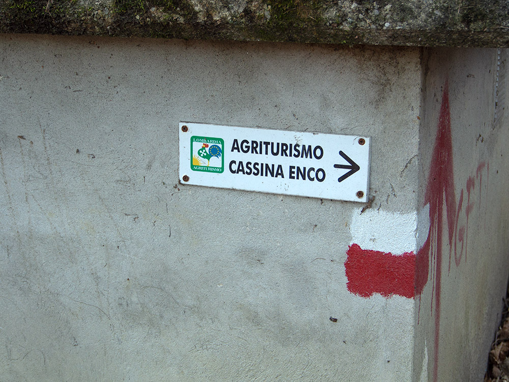 itinerario: dal piazzale di Ponte oscuro si imbocca via Caprone che è l'inizio dell'itinerario [], su strada cementata e in leggera salita [], dopo una prima curva la pendenza aumenta [] e si raggiunge un incrocio, prendere la stradina di dx come indicato dalla segnaletica [ ]. La stradina ora diventa agro-silvo-pastorale, e si percorre una zona a vincolo idrogeologico [ ]; si supera il casello dell'acquedotto []. Dopo una curva e controcurva la pendenza diminuisce [], e si arriva a un tornante dove sulla dx si stacca una stradina, si deve proseguire lungo il tornante sulla sx [ ]. Ora il fondo della stradina abbandona il cemento e diventa in terra-battuta [], si raggiunge una deviazione a dx che conduce a una azienda agricola []; si prosegue a sx costeggiando la proprietà agricola [], e a un tornante si deve lasciare la via percorsa finora e prendere a dx come indicato dai cartelli segnavia [ ]. Si continua nel bosco e sotto sulla dx si intravede fra gli alberi il caseggiato dell'azienda agricola [], proseguendo si raggiunge un'area sosta con tavolo e panche per il pic-nic [ ]. Si prosegue lungo la mulattiera, e si arriva a una finestra nel bosco che sulla dx lascia vedere il paese di Rezzago [], e subito dopo si giunge a una biforcazione: a sx si prosegue per l'agriturismo di Enco e successivamente al Monte Palanzone a dx per Rezzago e i Funghi di Terra [ ]. Dopo la deviazione si continua a camminare nel bosco [], si sale ripido e si raggiungono dei caselli dell'acquedotto posti ai lati della stradina [ ]. Si continua a salire nel bosco [] e si supera l'ennesimo csello dell'acquedotto []. Poco oltre un cartello ci segnala che siamo vicini all'agriturismo di Enco [ ]. Lungo il percorso ci sono anche bolli CAI (bianchi e rossi) [], al termine della ripida salita il fondo in cemento lacia il posto a quello in terra battuta [], e più avanti c'è un altro punto sosta [ ]. Si procede in salita sulla stradina [ ], e si arriva a un ulteriore bivio, a sx si sale alla croce di Pizzallo, via Piazza Dorella, diritto si procede per Enco [ ] e si cammina in leggera discesa con a fianco una recinzione [],si supera una proprietà privata [] e si arriva all'agriturismo Cassina di Enco [ ].