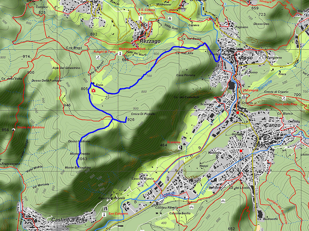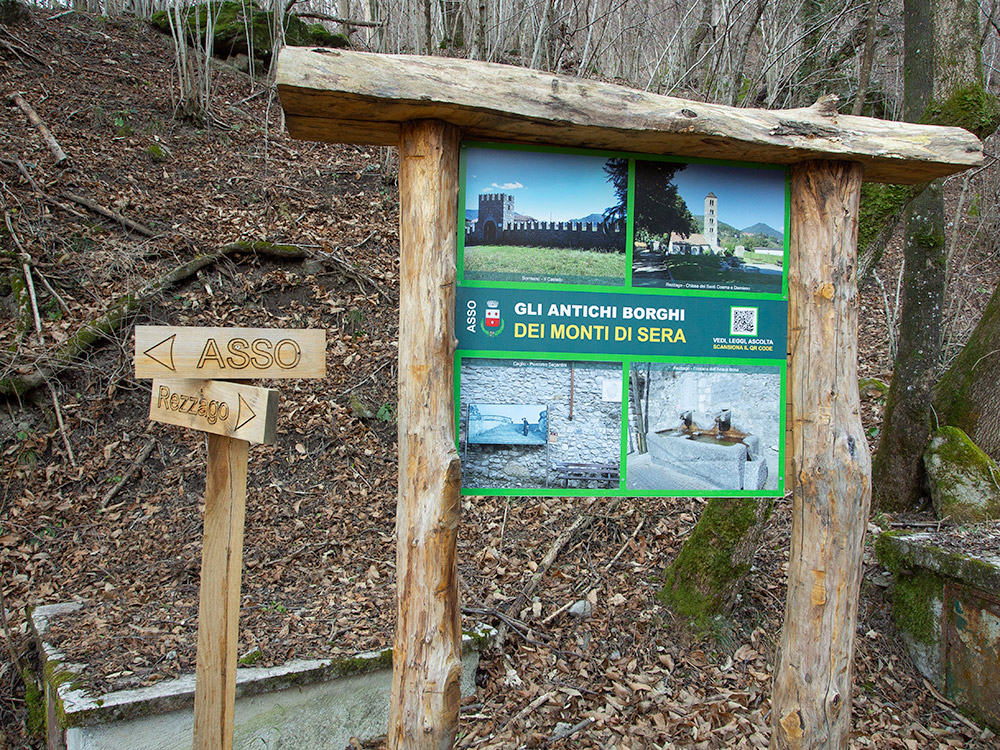 note: Il percorso segue in parte la mulattiera di collegamento fra Asso e Rezzago che l’Amministrazione Comunale di Asso ha deciso di migliorare e recuperare. con il rifacimento totale della pavimentazione e l’eliminazione delle strettoie, per agevolare anche il passaggio delle macchine agricole in aree rurali e boschive ancora oggi molto ben tenute. La posa di una cartellonistica descrittiva del percorso e delle peculiarità dell’area circostante, la realizzazione di 5 aree di sosta con relativi tavoli di legno e panche, completano il rifacimento di un sentiero destinato a diventare un punto di riferimento fruibile e interessante per il turismo naturalistico e sportivo.