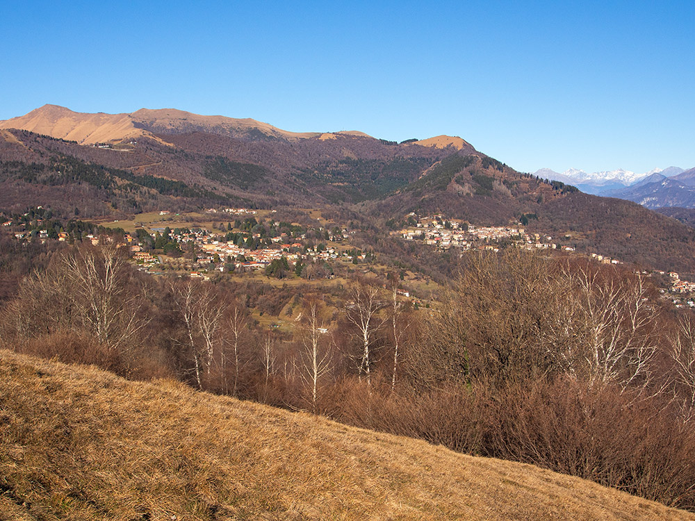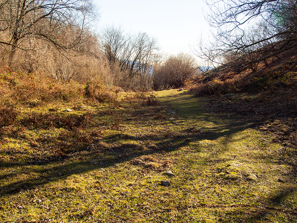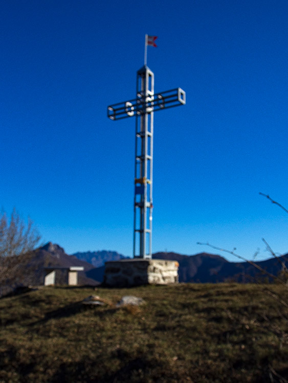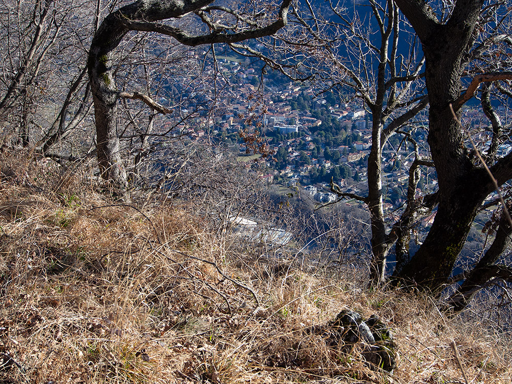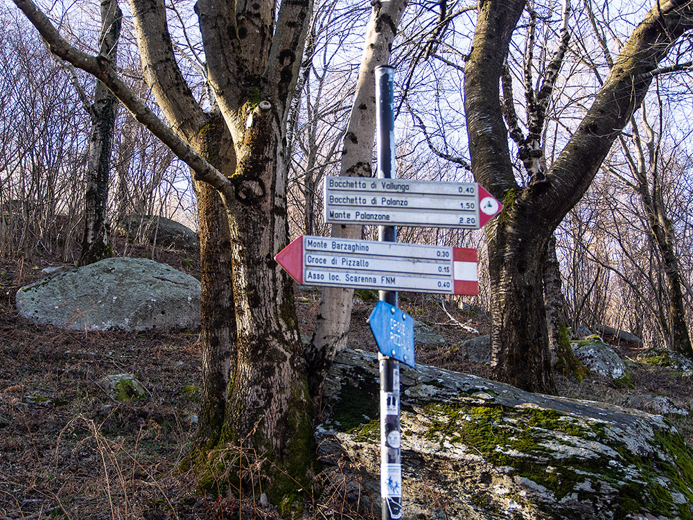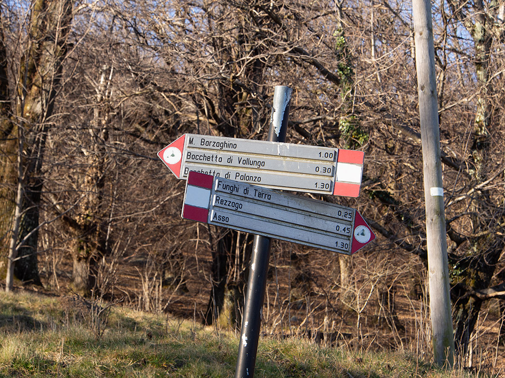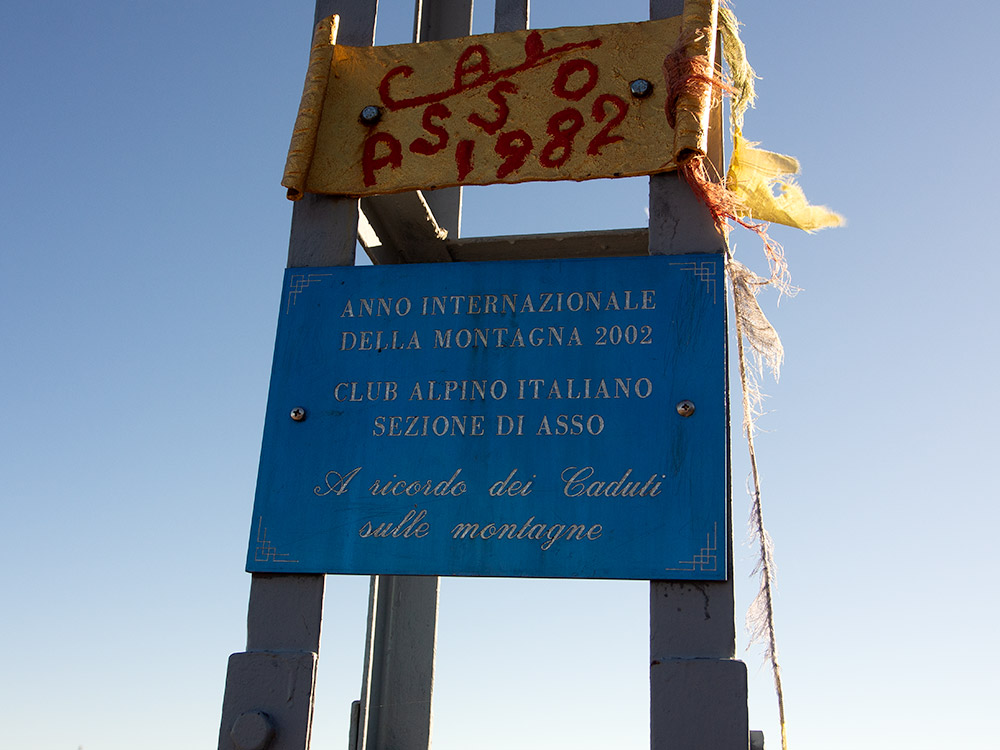 Poco oltre su stacca sulla sx una stradina agro-silvo-pastorale [ ]; si cammina in un castagneto [], si supera una fonte [] e si continua a salire [] e si arriva a un tornante con alla sx uno slargo prativo in località Bocchetta da Frecc [ ]. Si prende il sentiero come indicato dal cartello segnavia e si inizia a salire [ ], sino ad arrivare sul bordo di un crinale, oltre il quale ci si affaccia sul Pian d'Erba [ ]; il sentiero percorre il crinale [] sino a raggiungere il culmine dove è posta, a cura del CAI di Asso, la croce [ ] [].