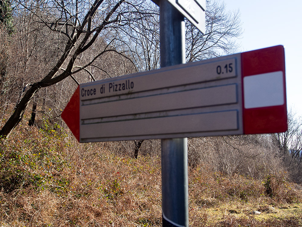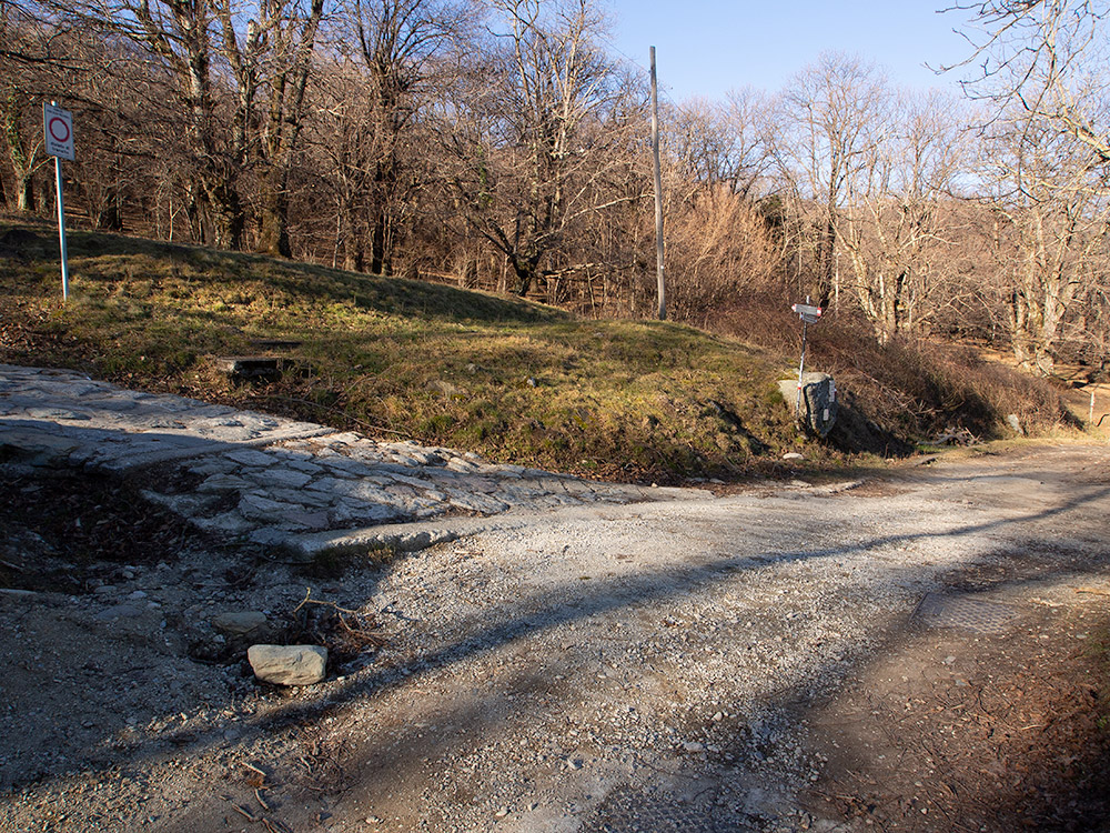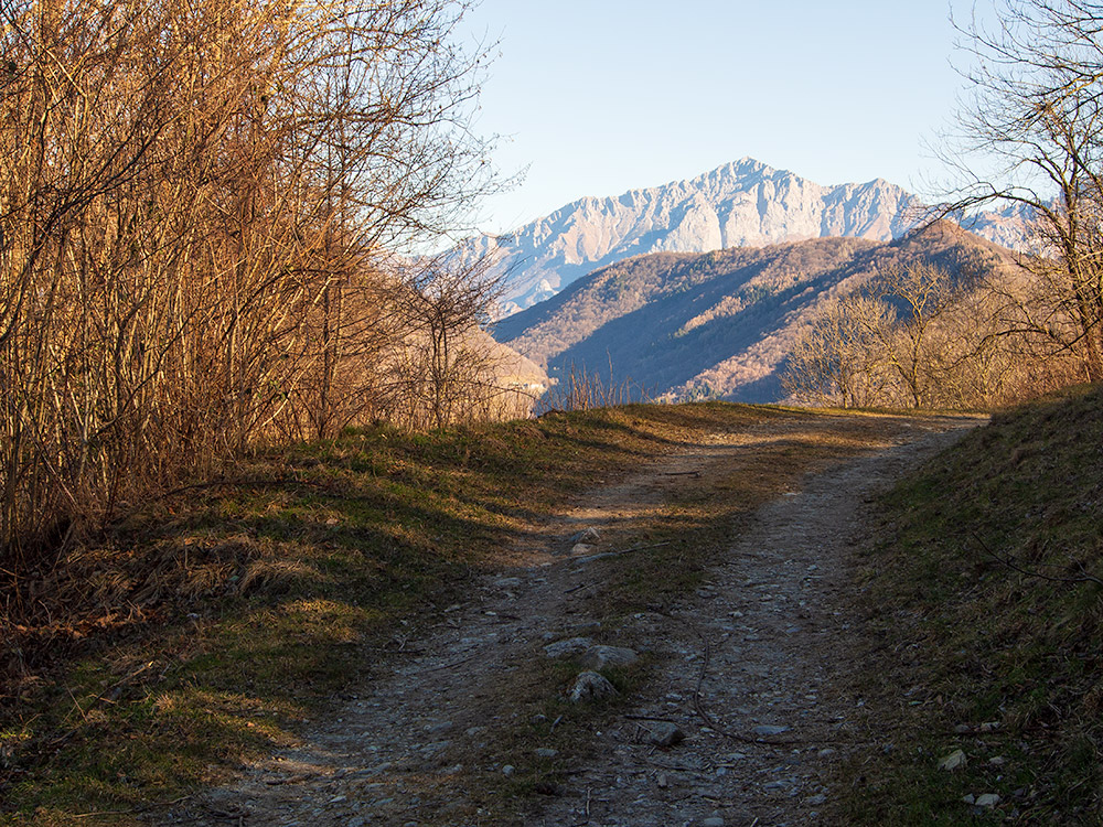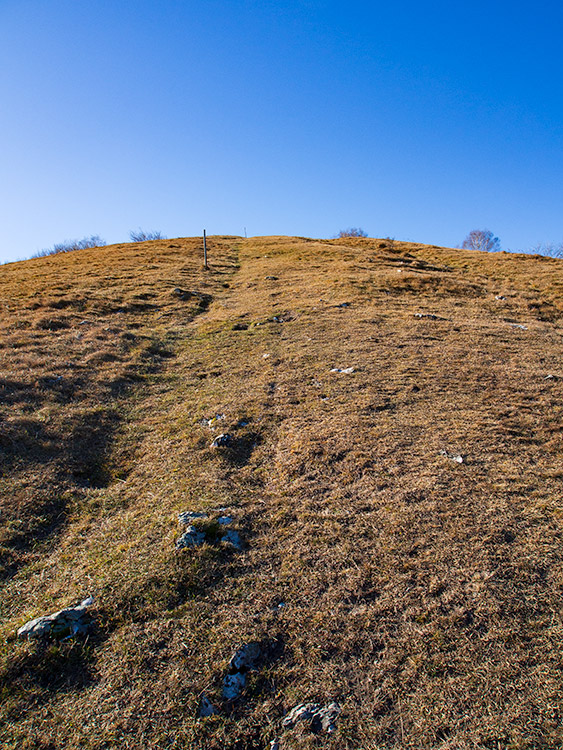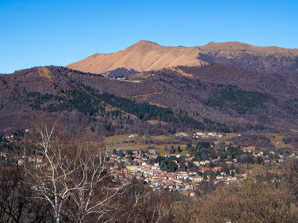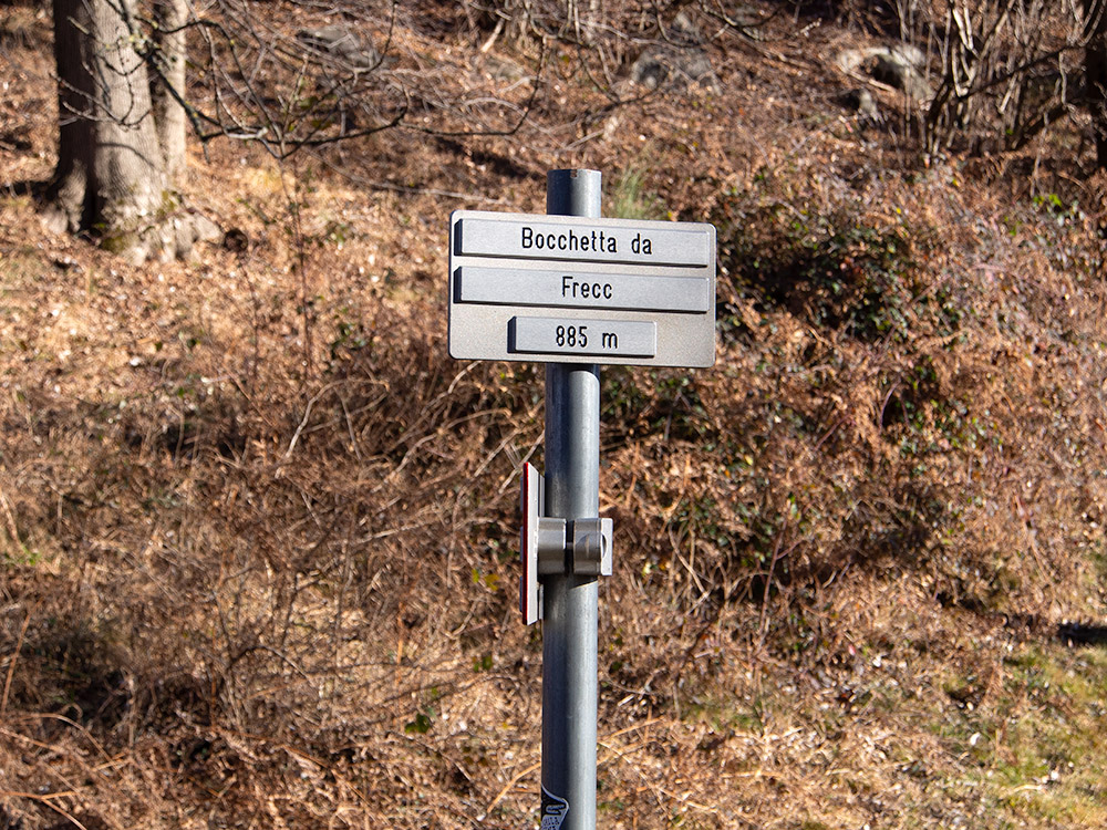 Poco oltre su stacca sulla sx una stradina agro-silvo-pastorale [ ]; si cammina in un castagneto [], si supera una fonte [] e si continua a salire [] e si arriva a un tornante con alla sx uno slargo prativo in località Bocchetta da Frecc [ ]. Si prende il sentiero come indicato dal cartello segnavia e si inizia a salire [ ], sino ad arrivare sul bordo di un crinale, oltre il quale ci si affaccia sul Pian d'Erba [ ]; il sentiero percorre il crinale [] sino a raggiungere il culmine dove è posta, a cura del CAI di Asso, la croce [ ] [].