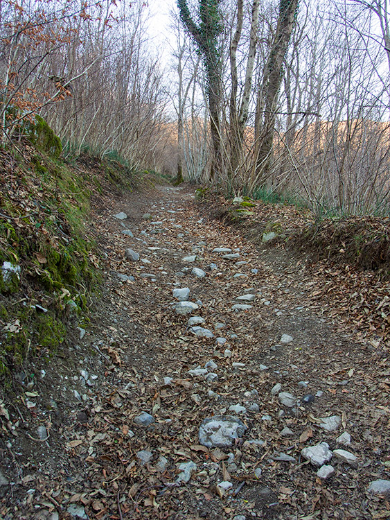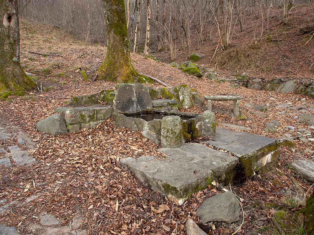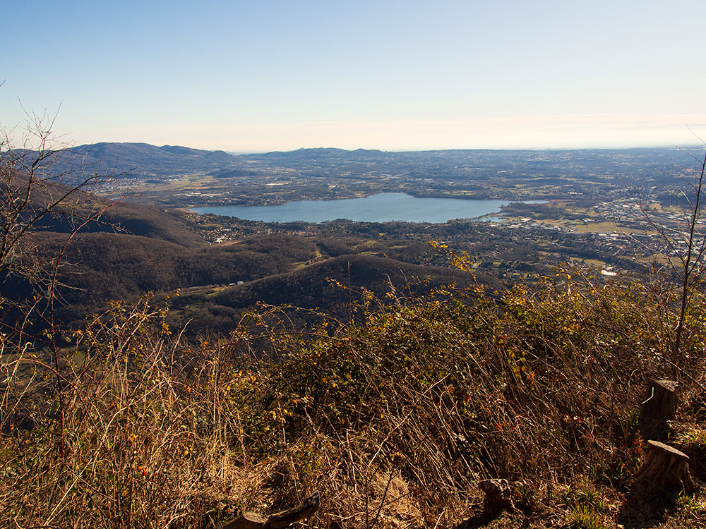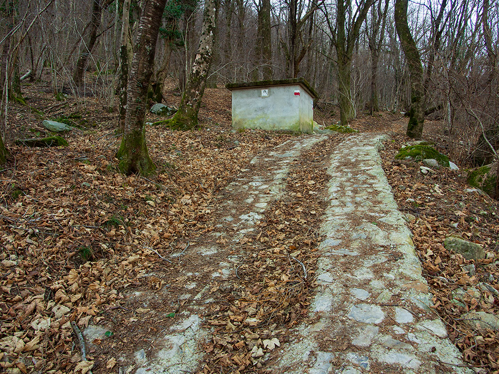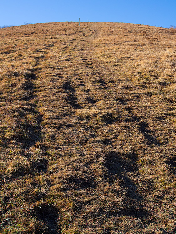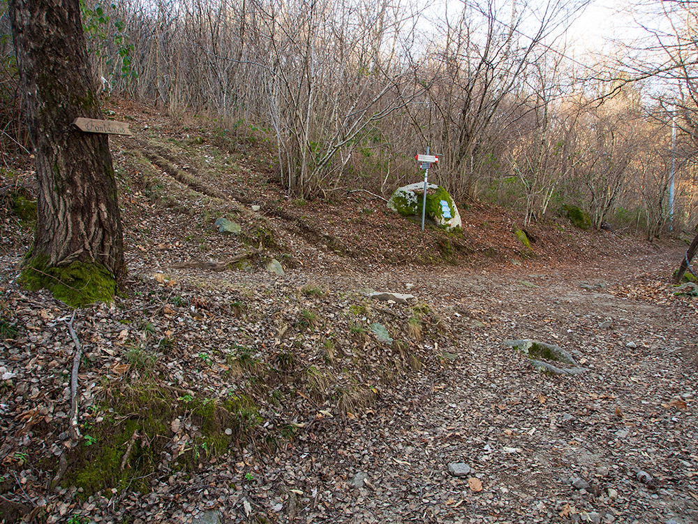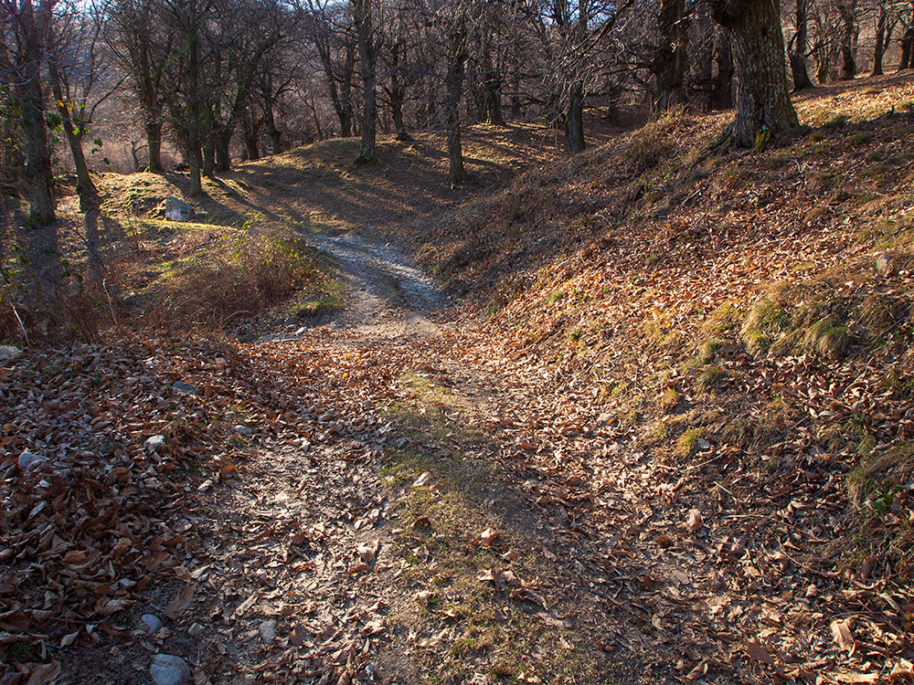 Poco oltre su stacca sulla sx una stradina agro-silvo-pastorale [ ]; si cammina in un castagneto [], si supera una fonte [] e si continua a salire [] e si arriva a un tornante con alla sx uno slargo prativo in località Bocchetta da Frecc [ ]. Si prende il sentiero come indicato dal cartello segnavia e si inizia a salire [ ], sino ad arrivare sul bordo di un crinale, oltre il quale ci si affaccia sul Pian d'Erba [ ]; il sentiero percorre il crinale [] sino a raggiungere il culmine dove è posta, a cura del CAI di Asso, la croce [ ] [].