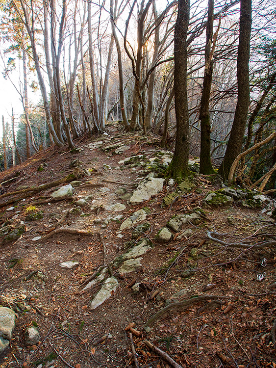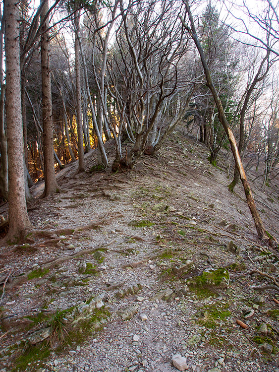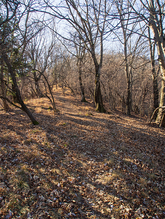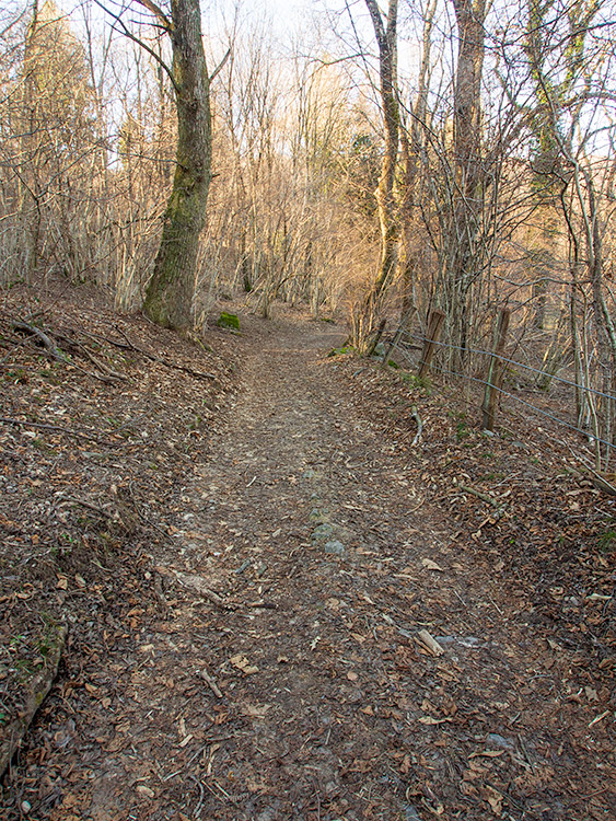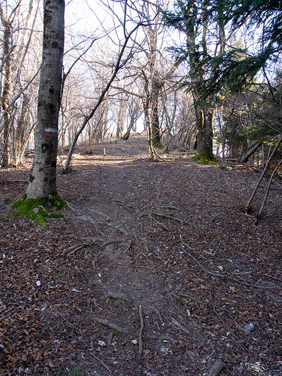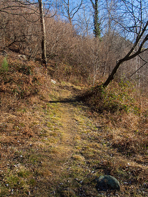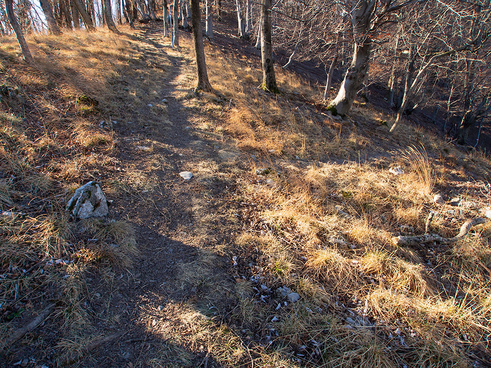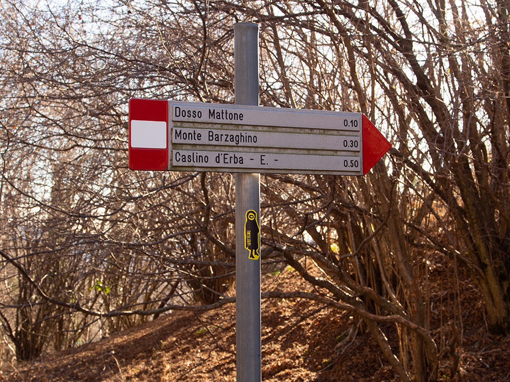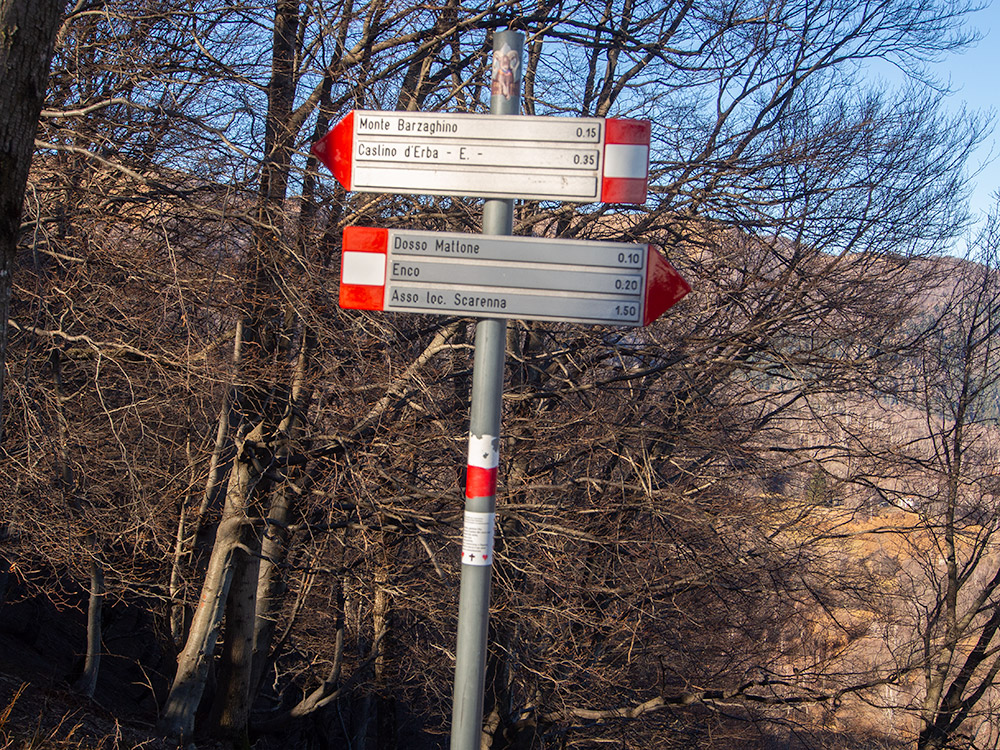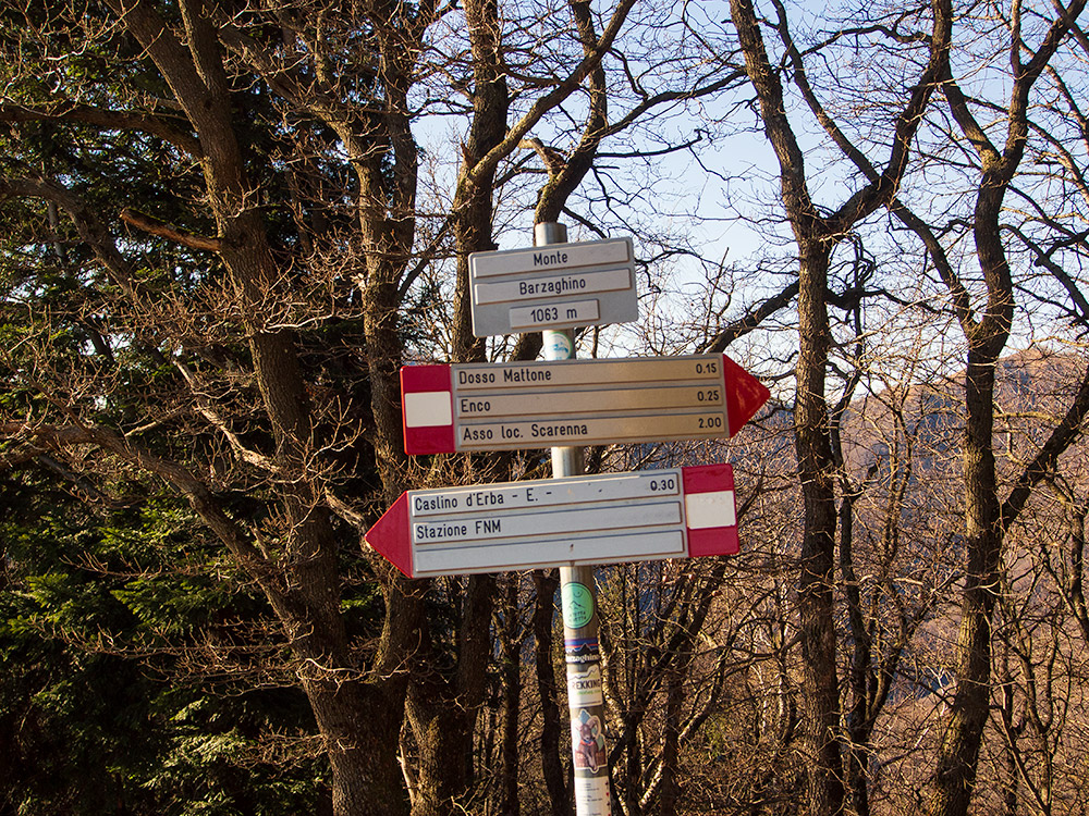 Ritornati alla Bocchetta da Frecc [], si sale dal lato opposto come indicato da un cartello segnavia []. Il sentiero, all'inizio scalinato [], sale molto ripido verso il Dosso Mattone [ ], che si raggiunge in 10/15 minuti [], ed è un ottimo punto panooramico [ ] []. Ora il sentiero procede nel bosco [], si oltrepassa un gruppo di faggi [] e si procede in salita non ripida, ma poi il sentiero spiana [] per poi ritornare in leggera salita avvicinandosi alla cima del Monte Freddo []. Più avanti confluisce da dx il sentiero che sale da Caslino d'Erba [ ], poi con un tratto in forte salita [] si raggiunge la cima del Monte Freddo []. Ora una breve discesa, poi un tratto pianeggiante [] e l'ultima salita [ ] che porta in cima al Monte Barzaghino [ ].
