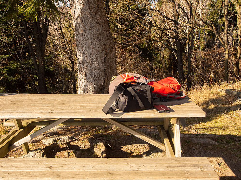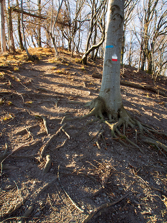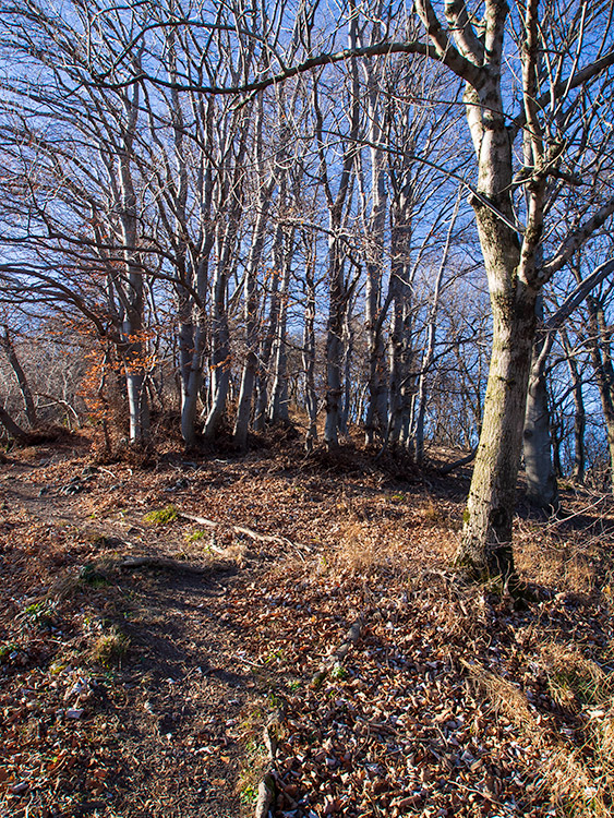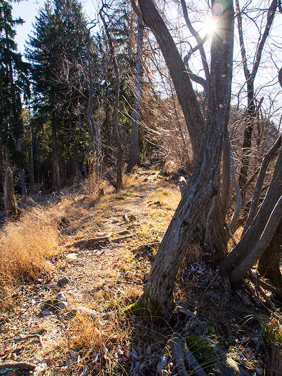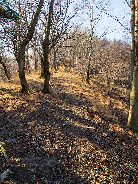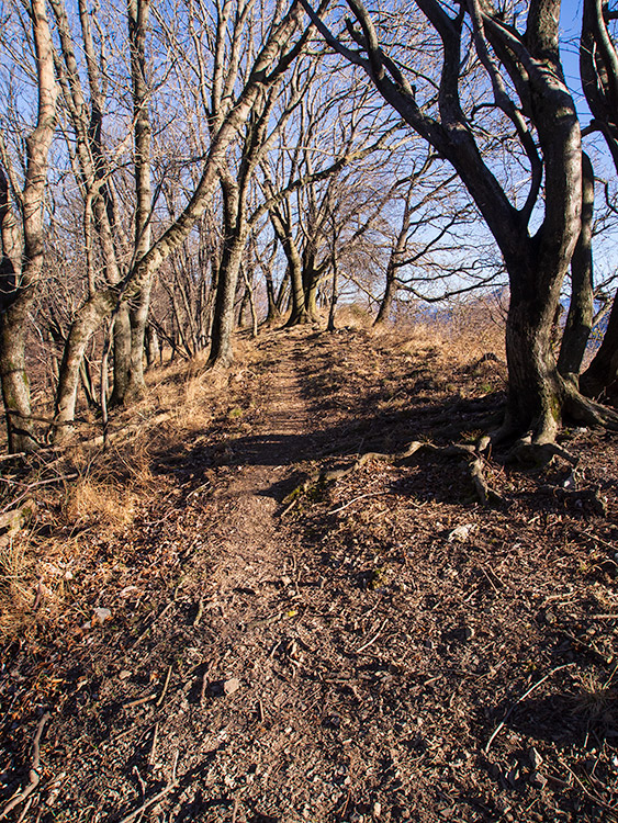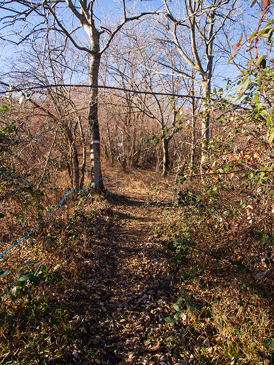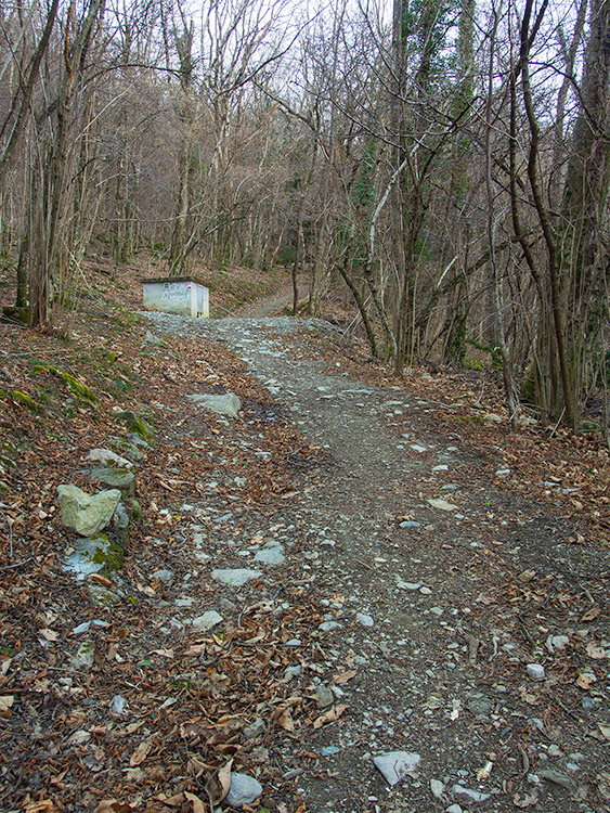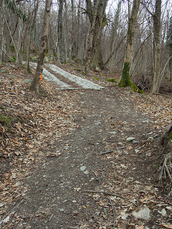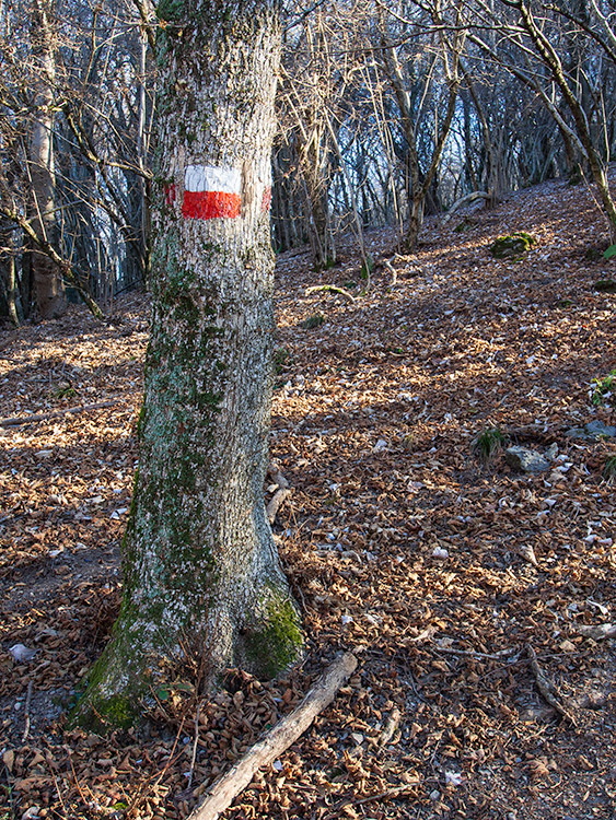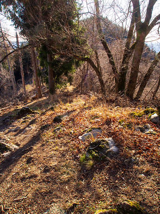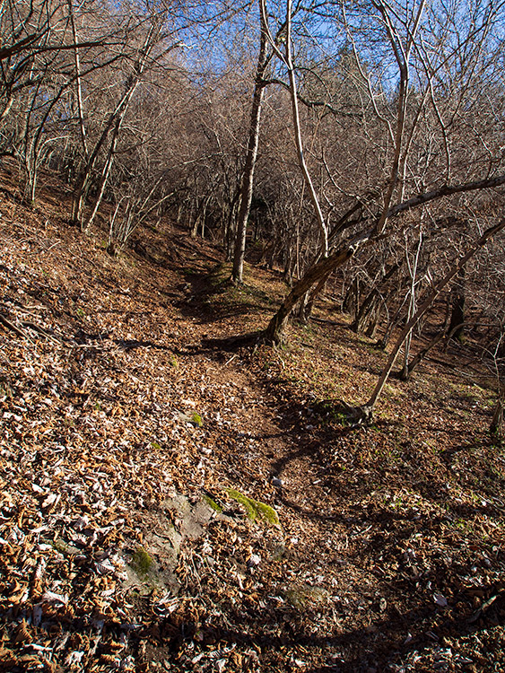 Ritornati alla Bocchetta da Frecc [], si sale dal lato opposto come indicato da un cartello segnavia []. Il sentiero, all'inizio scalinato [], sale molto ripido verso il Dosso Mattone [ ], che si raggiunge in 10/15 minuti [], ed è un ottimo punto panooramico [ ] []. Ora il sentiero procede nel bosco [], si oltrepassa un gruppo di faggi [] e si procede in salita non ripida, ma poi il sentiero spiana [] per poi ritornare in leggera salita avvicinandosi alla cima del Monte Freddo []. Più avanti confluisce da dx il sentiero che sale da Caslino d'Erba [ ], poi con un tratto in forte salita [] si raggiunge la cima del Monte Freddo []. Ora una breve discesa, poi un tratto pianeggiante [] e l'ultima salita [ ] che porta in cima al Monte Barzaghino [ ].