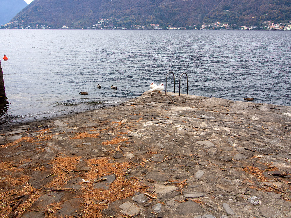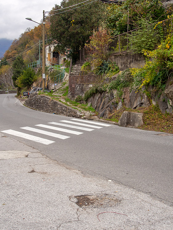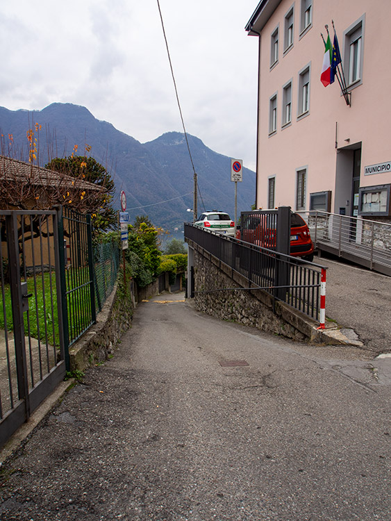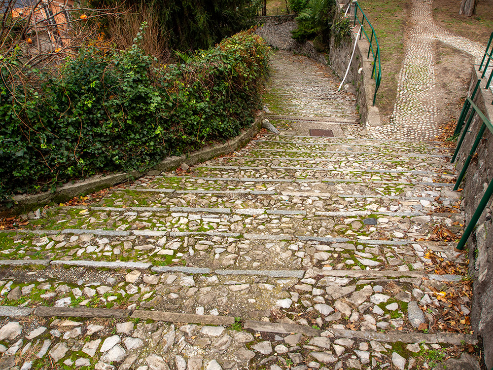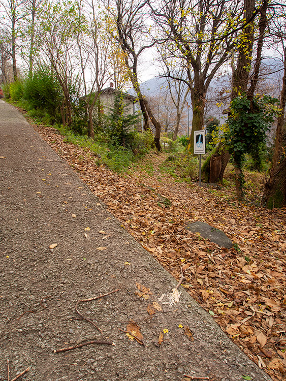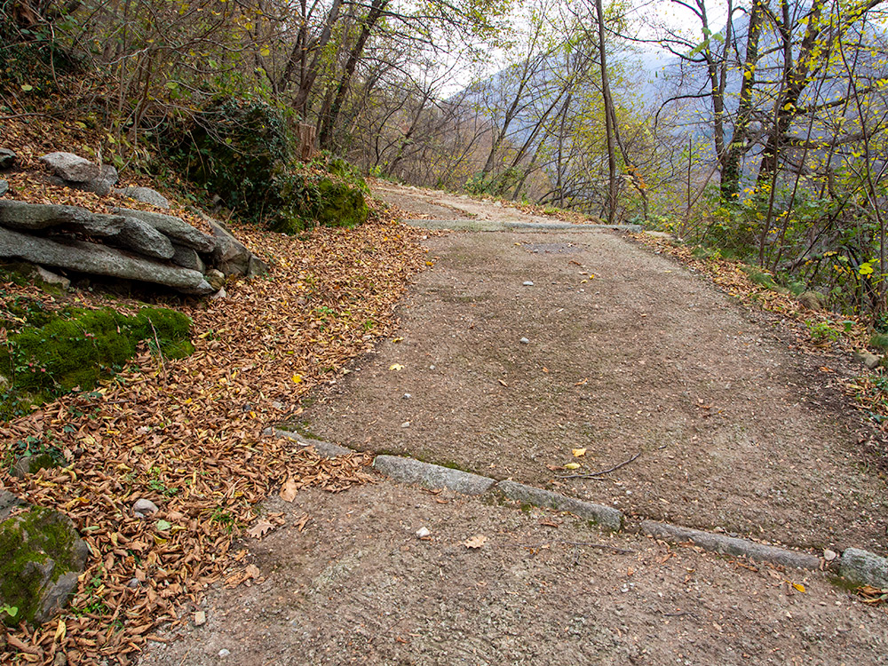itinerario: dalla piattaforma a lago si sale sino alla via Borgovecchio, si gira a dx e si procede in salita [] sino a raggiungere la piazza della chiesa [], si ignora la strada che sale alla SP583 e a lato chiesa si imbocca una stradinaa [] che rimanendo sotto la provinciale alla sua fine si congiunge con essa []. Attraversata la provinciale si imbocca un sentiero gradinato in forte salita [], si supera una cappella votiva, e ci si congiunge con la Strada Regia []. Si procede lungo di essa a dx (verso sud) sempre in salita [], ma poi il sentiero spiana []; a circa metā č presente a lato valle un grosso masso erratico [], e in breve si raggiungono le prime case di Vico []. Si attraversa la frazione lungo via Santa Maria e si raggiunge la piazzetta Verigā, ove č presente un bar che puō fungere da punto di ristoro []. Proseguendo si arriva alla chiesa di Santa Maria in Vico, un gioiello alto medioevale con all'interno importanti affreschi del pittore tornasco De Benzi, risalenti agli inizi del '500, come pure il polittico sulla parete di fondo del presbiterio []; l'interno č visitabile facendo richiesta al parroco. Si raggiunge e si attraversa la SP44 [], e si procede lungo via Scerio attraversando l'omonima frazione, poi lungo via Tofe si attraversa la frazione di Onzanigo [], fino ad arrivare a un lavatoio e al ponte sul torrente Tuf [], che permette di attraversarlo. Oltre il ponte c'č una piazzetta e alla sua sx inizia una stradina, gradinata al centro, in ripida salita []; usciti dall'abitato di Nesso la pendenza diminuisce e il fondo divente in cemento con tratti in terra battuta []; si arriva a un tornante a sx [], e dopo un breve rettilineo a un tornante a dx []. Una ventina di metri dopo il tornante a dx parte un sentiero [], che in piano [] porta alla forra della cascata []. Per una miglior visione si consiglia di attraversare sui massi (con attenzione) il ruscello che scorre ai piedi della cascata e di portarsi sulla sinistra orografica della forra [][].