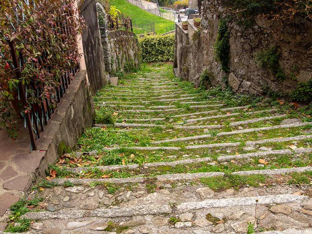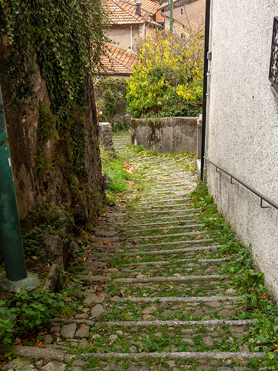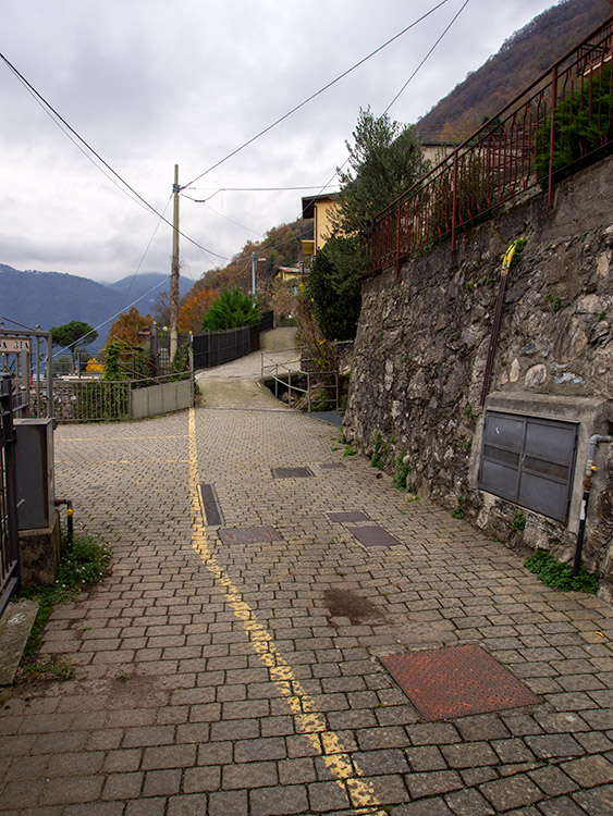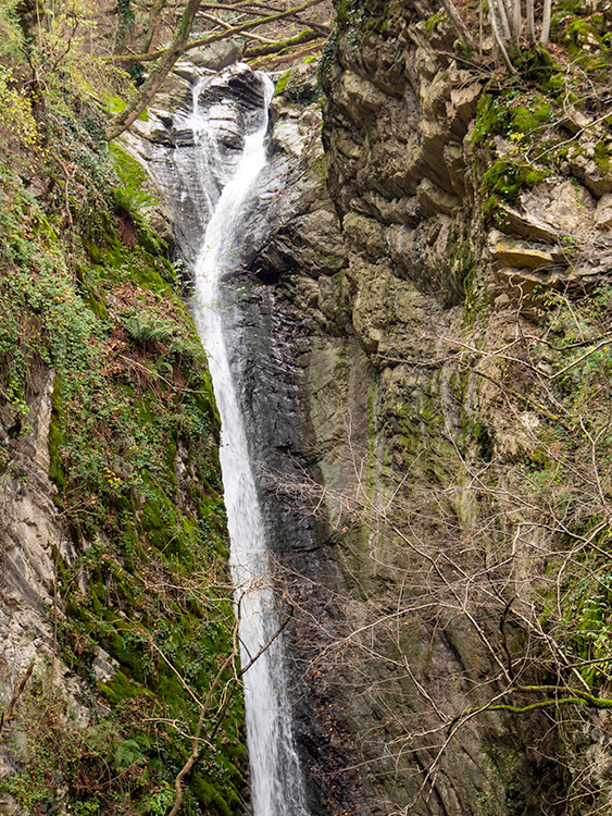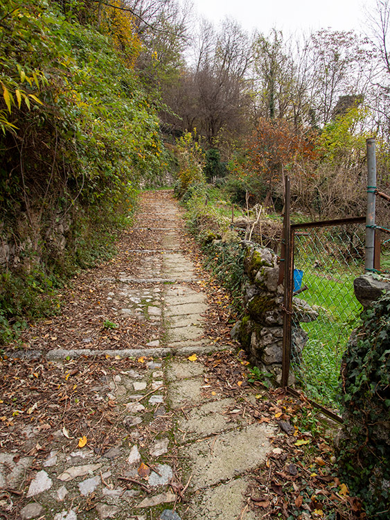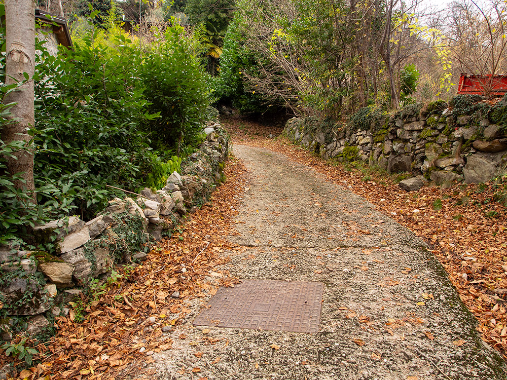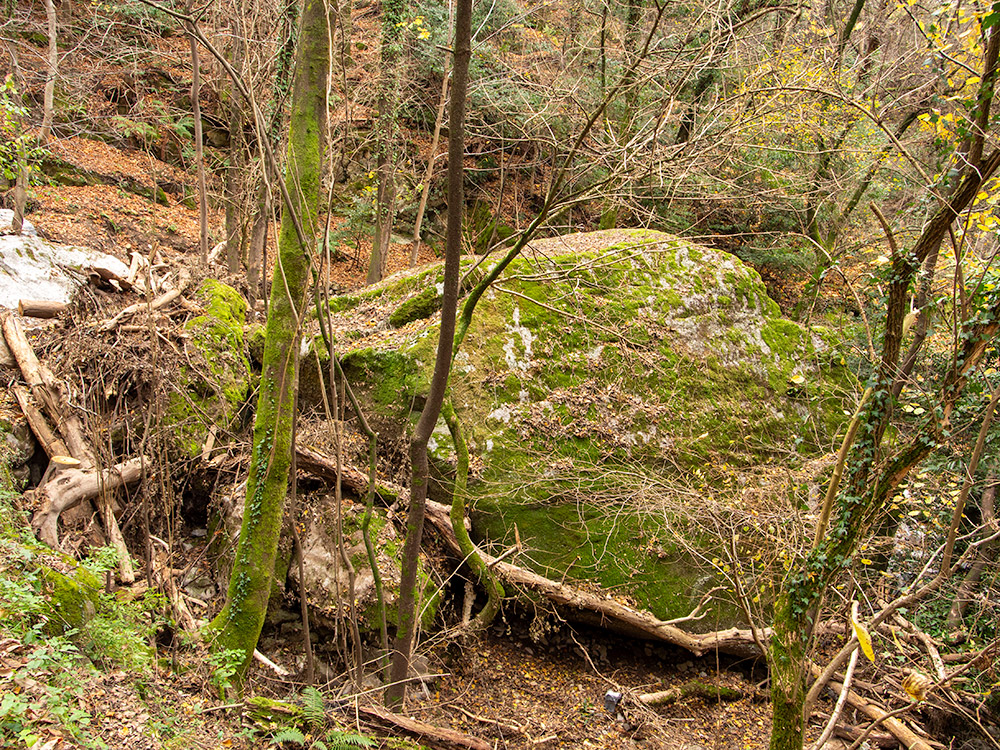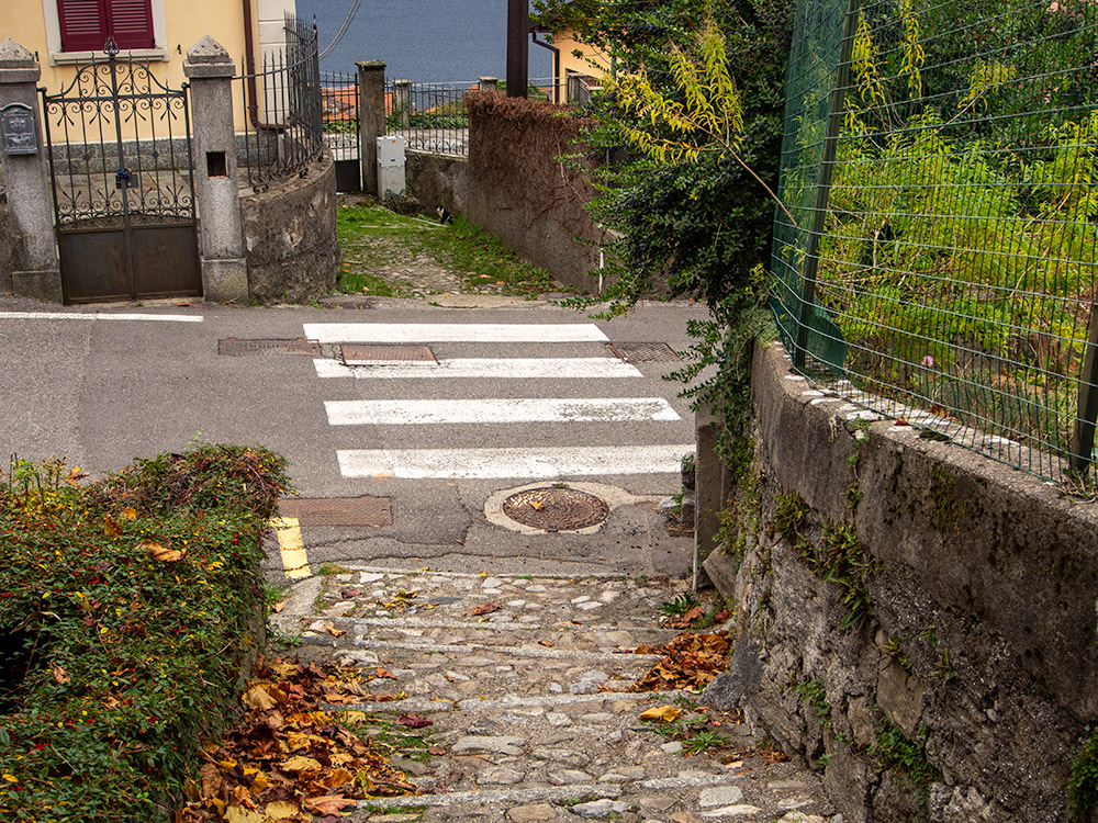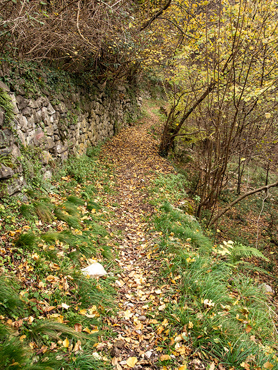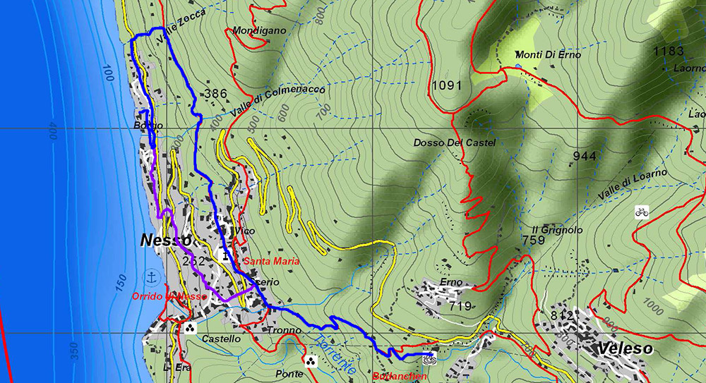 itinerario: dalla piattaforma a lago si sale sino alla via Borgovecchio, si gira a dx e si procede in salita [] sino a raggiungere la piazza della chiesa [], si ignora la strada che sale alla SP583 e a lato chiesa si imbocca una stradinaa [] che rimanendo sotto la provinciale alla sua fine si congiunge con essa []. Attraversata la provinciale si imbocca un sentiero gradinato in forte salita [], si supera una cappella votiva, e ci si congiunge con la Strada Regia []. Si procede lungo di essa a dx (verso sud) sempre in salita [], ma poi il sentiero spiana []; a circa metā č presente a lato valle un grosso masso erratico [], e in breve si raggiungono le prime case di Vico []. Si attraversa la frazione lungo via Santa Maria e si raggiunge la piazzetta Verigā, ove č presente un bar che puō fungere da punto di ristoro []. Proseguendo si arriva alla chiesa di Santa Maria in Vico, un gioiello alto medioevale con all'interno importanti affreschi del pittore tornasco De Benzi, risalenti agli inizi del '500, come pure il polittico sulla parete di fondo del presbiterio []; l'interno č visitabile facendo richiesta al parroco. Si raggiunge e si attraversa la SP44 [], e si procede lungo via Scerio attraversando l'omonima frazione, poi lungo via Tofe si attraversa la frazione di Onzanigo [], fino ad arrivare a un lavatoio e al ponte sul torrente Tuf [], che permette di attraversarlo. Oltre il ponte c'č una piazzetta e alla sua sx inizia una stradina, gradinata al centro, in ripida salita []; usciti dall'abitato di Nesso la pendenza diminuisce e il fondo divente in cemento con tratti in terra battuta []; si arriva a un tornante a sx [], e dopo un breve rettilineo a un tornante a dx []. Una ventina di metri dopo il tornante a dx parte un sentiero [], che in piano [] porta alla forra della cascata []. Per una miglior visione si consiglia di attraversare sui massi (con attenzione) il ruscello che scorre ai piedi della cascata e di portarsi sulla sinistra orografica della forra [][].
