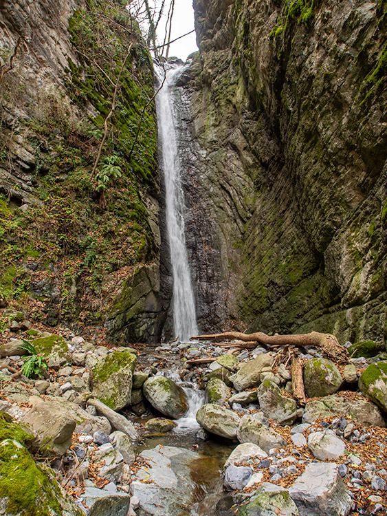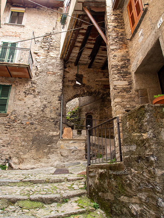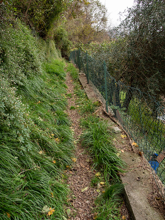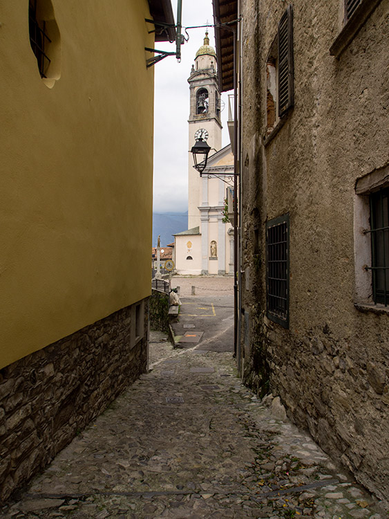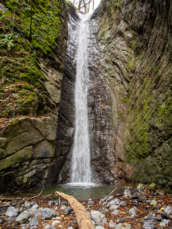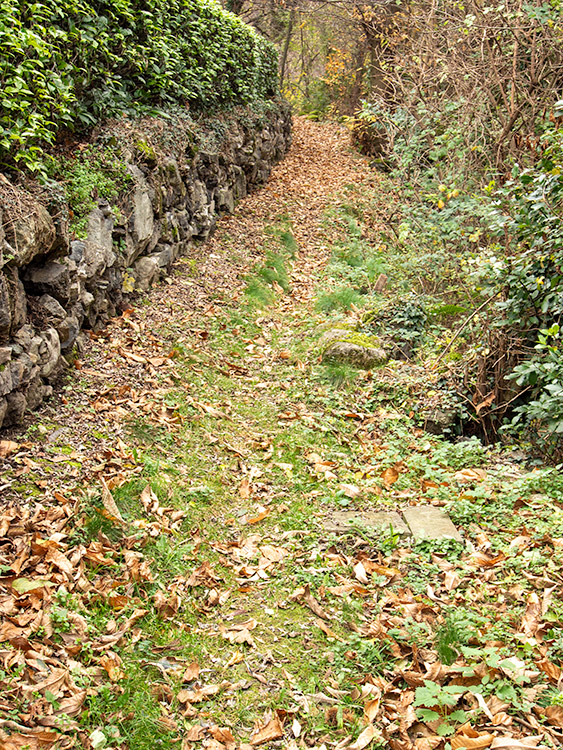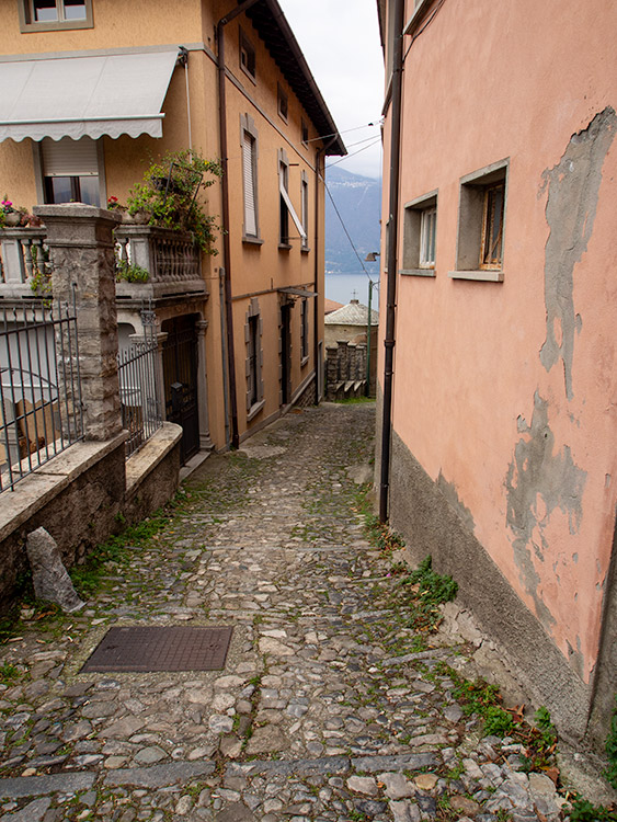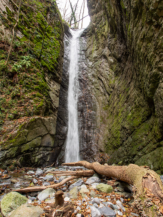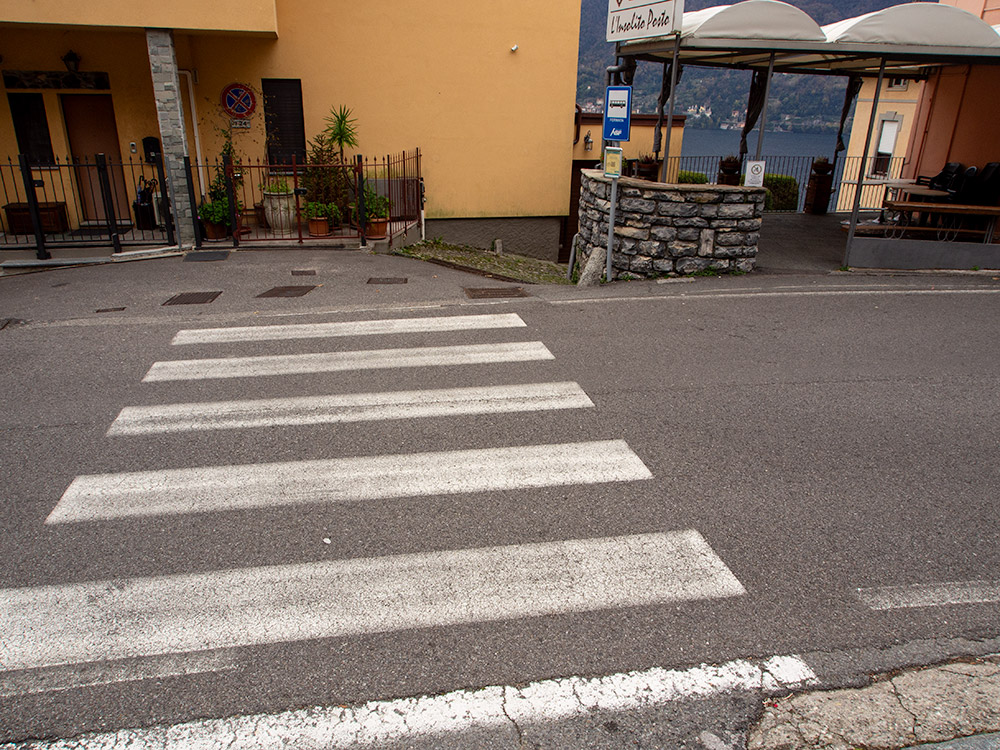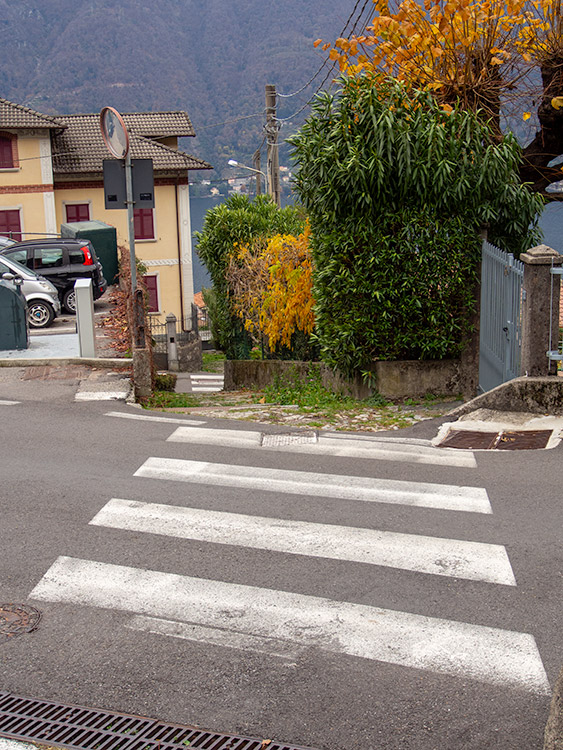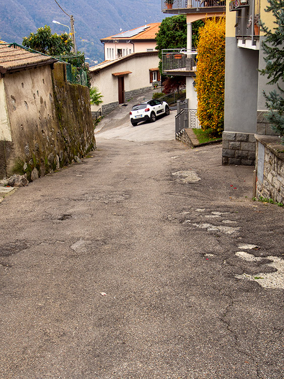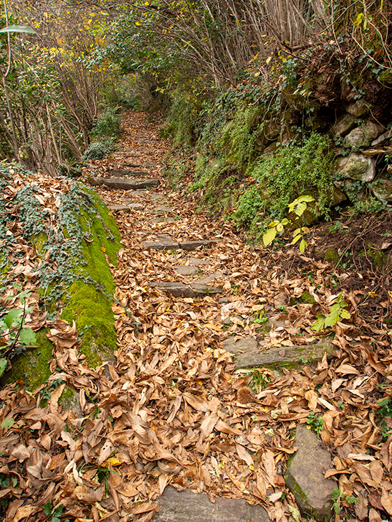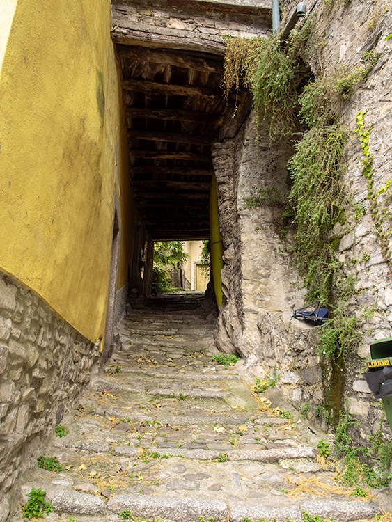 itinerario: dalla piattaforma a lago si sale sino alla via Borgovecchio, si gira a dx e si procede in salita [] sino a raggiungere la piazza della chiesa [], si ignora la strada che sale alla SP583 e a lato chiesa si imbocca una stradinaa [] che rimanendo sotto la provinciale alla sua fine si congiunge con essa []. Attraversata la provinciale si imbocca un sentiero gradinato in forte salita [], si supera una cappella votiva, e ci si congiunge con la Strada Regia []. Si procede lungo di essa a dx (verso sud) sempre in salita [], ma poi il sentiero spiana []; a circa metā č presente a lato valle un grosso masso erratico [], e in breve si raggiungono le prime case di Vico []. Si attraversa la frazione lungo via Santa Maria e si raggiunge la piazzetta Verigā, ove č presente un bar che puō fungere da punto di ristoro []. Proseguendo si arriva alla chiesa di Santa Maria in Vico, un gioiello alto medioevale con all'interno importanti affreschi del pittore tornasco De Benzi, risalenti agli inizi del '500, come pure il polittico sulla parete di fondo del presbiterio []; l'interno č visitabile facendo richiesta al parroco. Si raggiunge e si attraversa la SP44 [], e si procede lungo via Scerio attraversando l'omonima frazione, poi lungo via Tofe si attraversa la frazione di Onzanigo [], fino ad arrivare a un lavatoio e al ponte sul torrente Tuf [], che permette di attraversarlo. Oltre il ponte c'č una piazzetta e alla sua sx inizia una stradina, gradinata al centro, in ripida salita []; usciti dall'abitato di Nesso la pendenza diminuisce e il fondo divente in cemento con tratti in terra battuta []; si arriva a un tornante a sx [], e dopo un breve rettilineo a un tornante a dx []. Una ventina di metri dopo il tornante a dx parte un sentiero [], che in piano [] porta alla forra della cascata []. Per una miglior visione si consiglia di attraversare sui massi (con attenzione) il ruscello che scorre ai piedi della cascata e di portarsi sulla sinistra orografica della forra [][].