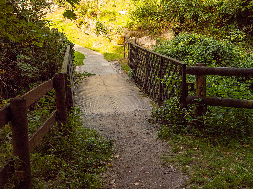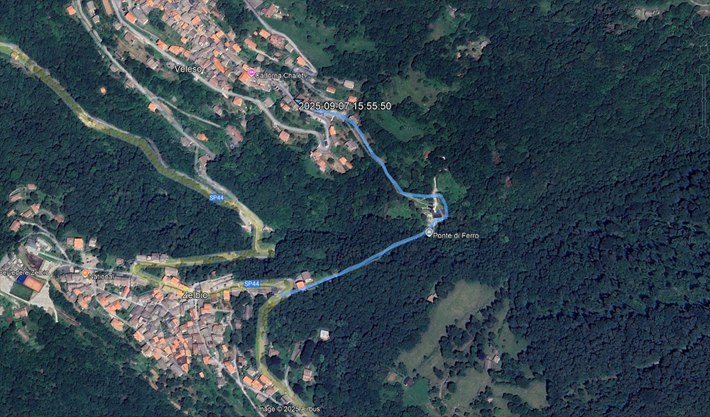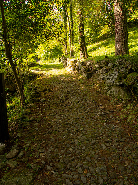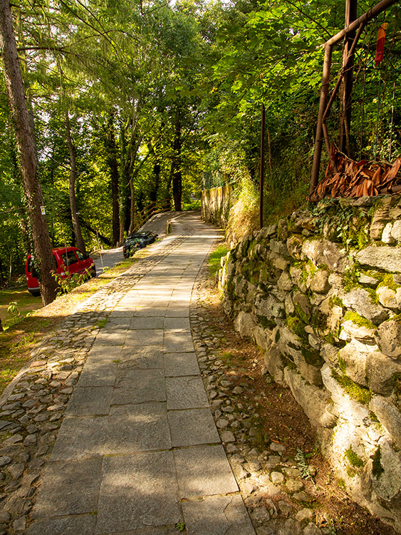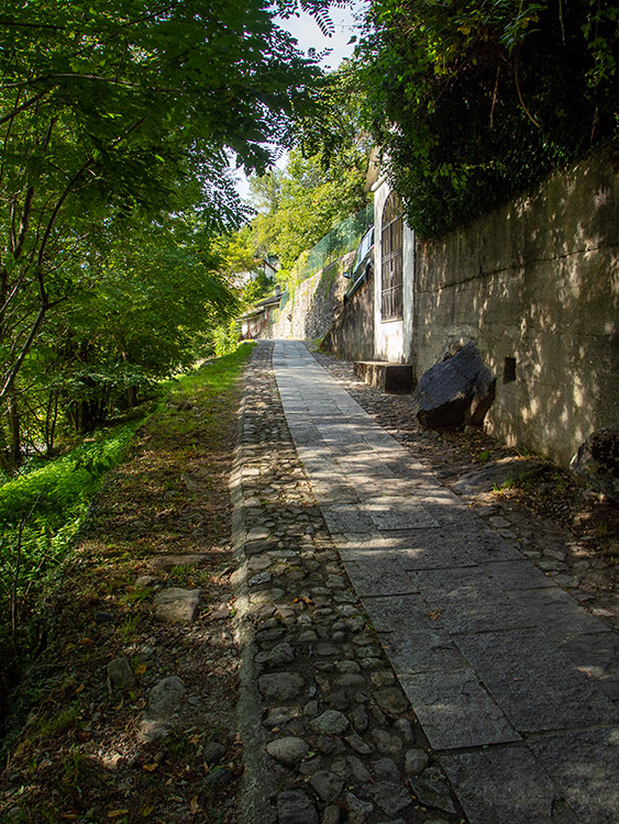 itinerario: dalla Sp44 si imbocca una stradina agro-silvo-pastorale, inizialmente lastricata [ ], e si entra nel bosco [ ], per poi arrivare quasi subilto al Ponte di Ferro [] su cui č possibile oltrepassare una gola in cui scorre un torrente [ ]. Superato il ponte si procede verso una abitazione privata (negli anni passati sede di un bed and breakfast e ristorante) [ ]. Ora si sale una scalinata, al termine della quale si gira a sx (a dx si stacca il sentiero che sale al Pian del Tivano per il sentiero di "Lut": descrizione presente a questa pagina) [], si continua in salita sulla stradina con fondo in acciottolato [ ], e si arriva a una curva a sx subito seguita da una a dx []. Ora il fondo della stradina č lastricato [], dopo una curva č presente sulla dx una edicola religiosa [], poi in leggera discesa verso la piazza Monsignor Eusebio Zerboni []. Qui termina la passeggiata [ ].