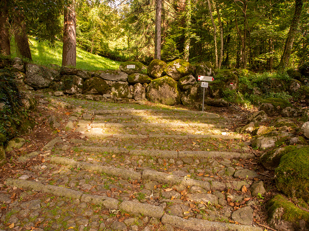 tipo di tracciato: il primo e l'ultimo terzo del tracciato sono su stradina lastricata con poco pendenza, il tratto mediano sono su stradina con fondo in terra e scalinata.